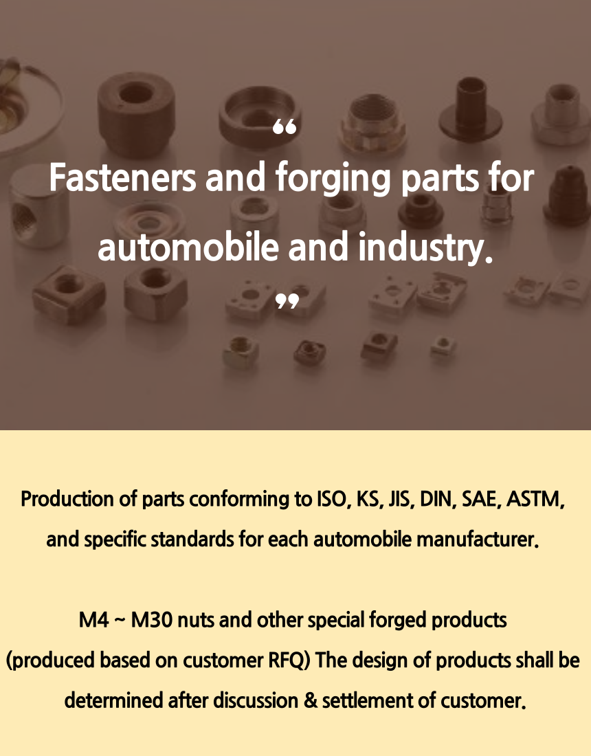 Combining leading edge tech. PUNGKANG Co Ltds unique know-how, an Enterprise that creates the future of Automotive parts industry. PUNGKANG Co Ltd was established in 1974 as an enterprise which professionally manufactures Nuts for Automotive industry. Together with the continuous development of the Korean automotive industry over the past 48 years, PUNGKANG Co Ltd has taken root deeply thru. unceasing efforts as an enterprise specializing in automotive parts that produces Nuts and Forged products and supplies to domestic overseas automotive companies which satisfy high technology and quality level of the automobile industry.